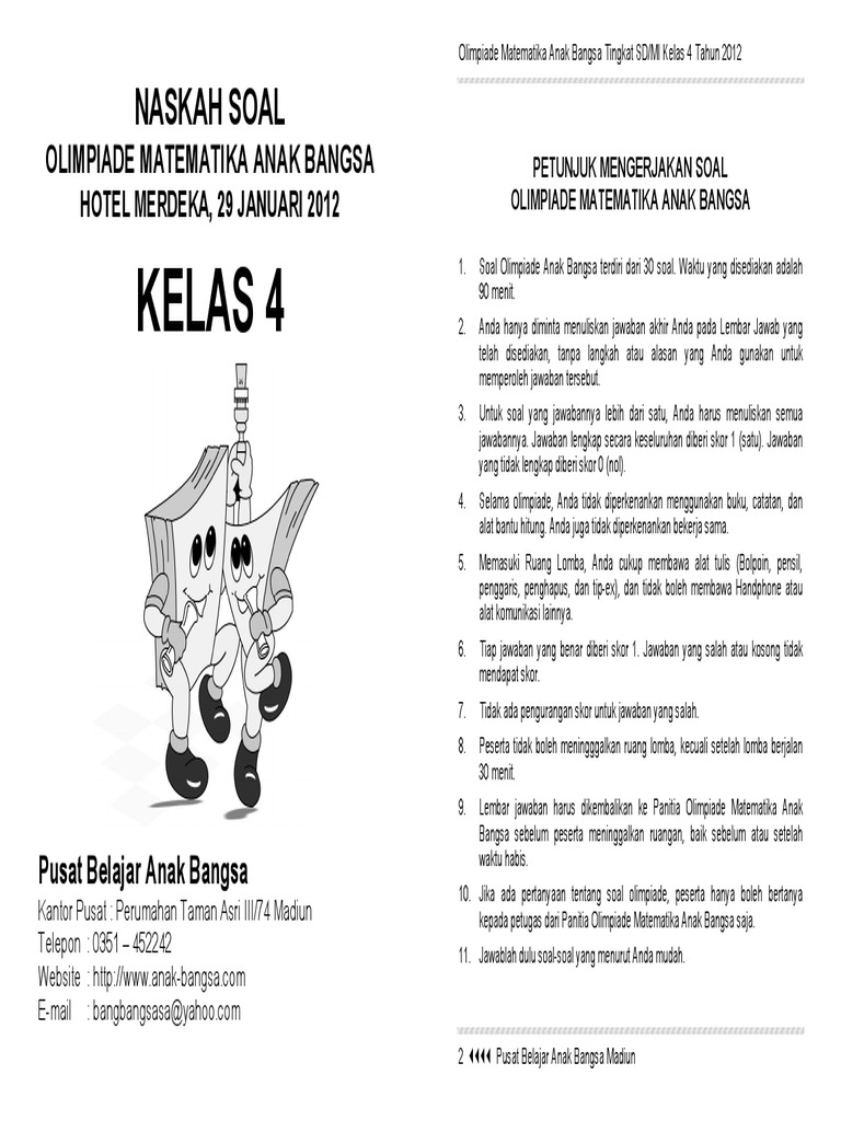 Aug 31 2020 Soal matematika kelas 4 yang kami buat bersumber dari buku matematika dan dari guru SD yang mengajar di kelas 4. 37 Full PDFs related to this paper. Download Soal Olimpiade Matematika Kelas 3 dan 4 SD Plus Kunci Jawabannya Untuk bisa mengikuti Lomba Olimpiade Matematika diperlukan persiapan yang matang.